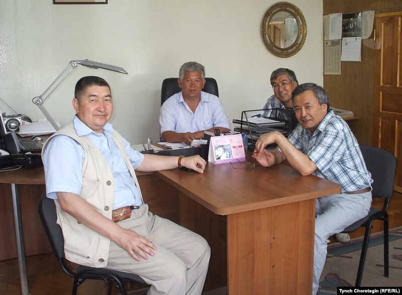 Э.Нурушев (оңдо) кесиптештери Бекташ Шамшиев, Кыяс Молдокасымов жана Тынчтыкбек Чоротегин менен “Кыргыз туусу” гезитинин башкеңсесинде. Бишкек, 2008-жылдын 14-июлу. TCh.